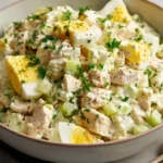 This chicken salad is a simple crowd-pleaser. It comes together fast, uses common pantry items, and tastes fresh and satisfying. The mayonnaise gives a silky mouthfeel, Dijon adds a bright tang, and celery brings a clean crunch. It’s ideal for quick lunches, picnic boxes, or light dinners. The smell is savory and comforting, and the appearance is pale and inviting with specks of green celery and golden egg.
