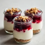 These jars are quick, no-bake, and visually appealing. They balance sweet cherry topping with creamy, slightly tangy cheesecake filling and a buttery, crunchy crust. The jars make portion control easy and are perfect for potlucks, picnics, or a simple family dessert. You get great texture contrast — crisp crumb, silky filling, and juicy fruit — in every spoonful.