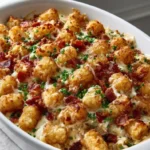 This Chicken Beef Bacon Ranch Tater Tot Casserole is a cozy, craveable bake that layers seasoned ground chicken and beef with smoky bacon, creamy mushroom soup, ranch seasoning, and a crisp tater tot topping. It smells like comfort food as it bakes — savory, cheesy, and slightly buttery from the tater tots. The texture is a pleasing mix of tender meat, melty cheese, and crunchy golden tots. If you enjoy hearty tater tot casseroles, you might also like a lighter, creamy variation like Chicken Alfredo Tater Tot Casserole for a different flavor profile.