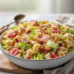 You will cook the pasta, mix the salad ingredients, whisk the dressing, then chill to let flavors meld. The steps are quick and straightforward. Use cooked chicken to save time. Crisp bacon adds smoky crunch while shredded cheddar brings a rich, salty finish.
