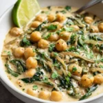 This dish comes together in one skillet. You’ll sauté aromatics, add the chickpeas and coconut milk, then simmer until the sauce thickens. Finish with lime for brightness and fresh cilantro for aroma. The result is a creamy, slightly tangy stew with tender chickpeas and soft veggies.