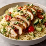 Bright, tangy, and herb-scented, these Flavorful Lemon Herb Grilled Chicken Couscous Bowls make a fresh weeknight dinner or a weekend lunch. The chicken grills to a slightly charred, juicy finish while the couscous soaks up lemon and olive oil. Crisp cucumber and sweet cherry tomatoes add crunch and brightness. If you like a hands-off option, try a related slow-cooker recipe for a similar lemon-herb chicken flavor in rice: slow-cooker lemon herb chicken rice recipe.