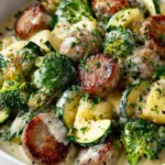 A rich and creamy keto dish featuring tender broccoli and cauliflower paired with savory sausage, perfect for a low-carb comfort meal.