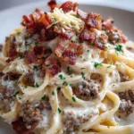 This Loaded Beef Bacon Cheeseburger Alfredo Pasta brings the bold flavors of a cheeseburger into a creamy, comforting pasta. Rich, cheesy sauce clings to fettuccine while savory ground beef and crisp bacon add texture and hearty flavor. It smells buttery and garlicky as it simmers and looks glossy and golden when served. If you like playful comfort food, this dish is a winner — and if you want another beef-and-bacon snack for a party, try this Beef Bacon Jalapeno Popper Cheese Balls recipe for an easy appetizer pairing.