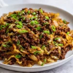 You’ll brown the beef, flavor it with garlic and ginger, then toss in shredded cabbage and soy sauce. The cabbage softens in minutes and soaks up the savory sauce. Work on medium heat so the beef browns and the cabbage cooks tender but still slightly crisp.