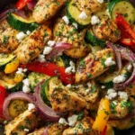 Pat the sliced chicken dry and season with a little salt and pepper. Slice bell peppers, zucchini, and onion into even strips. Mince the garlic and measure the oregano and basil. Have the lemon and feta ready to finish.