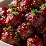 Festive and fast meatballs coated in a sweet-tangy cranberry-BBQ sauce, perfect for holiday appetizers or family meals.